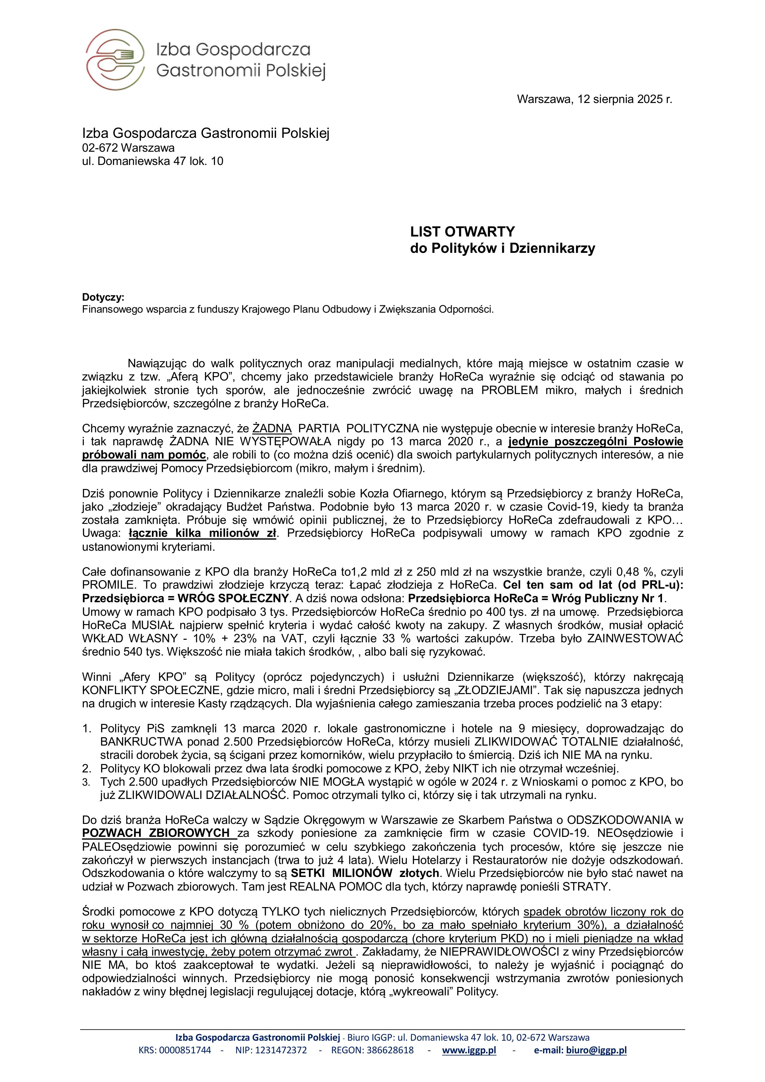 Publikujemy stanowisko Izby Gospodarczej Gastronomii Polskiej w formie Listu Otwartego do Polityków, dotyczące tzw. „Aferą KPO” w kontekście podpisanych ponad 3.000 umów przez Przedsiębiorców HoReCa, w ramach Finansowego wsparcia z funduszy Krajowego Planu Odbudowy i Zwiększania Odporności. Nawiązując do walk politycznych oraz manipulacji medialnych, które mają miejsce w ostatnim czasie w związku z tzw. „Aferą KPO”, chcemy jako przedstawiciele branży HoReCa wyraźnie się odciąć od stawania po jakiejkolwiek stronie tych sporów, ale jednocześnie zwrócić uwagę na PROBLEM mikro, małych i średnich Przedsiębiorców, szczególne z branży HoReCa. Czytaj więcej…