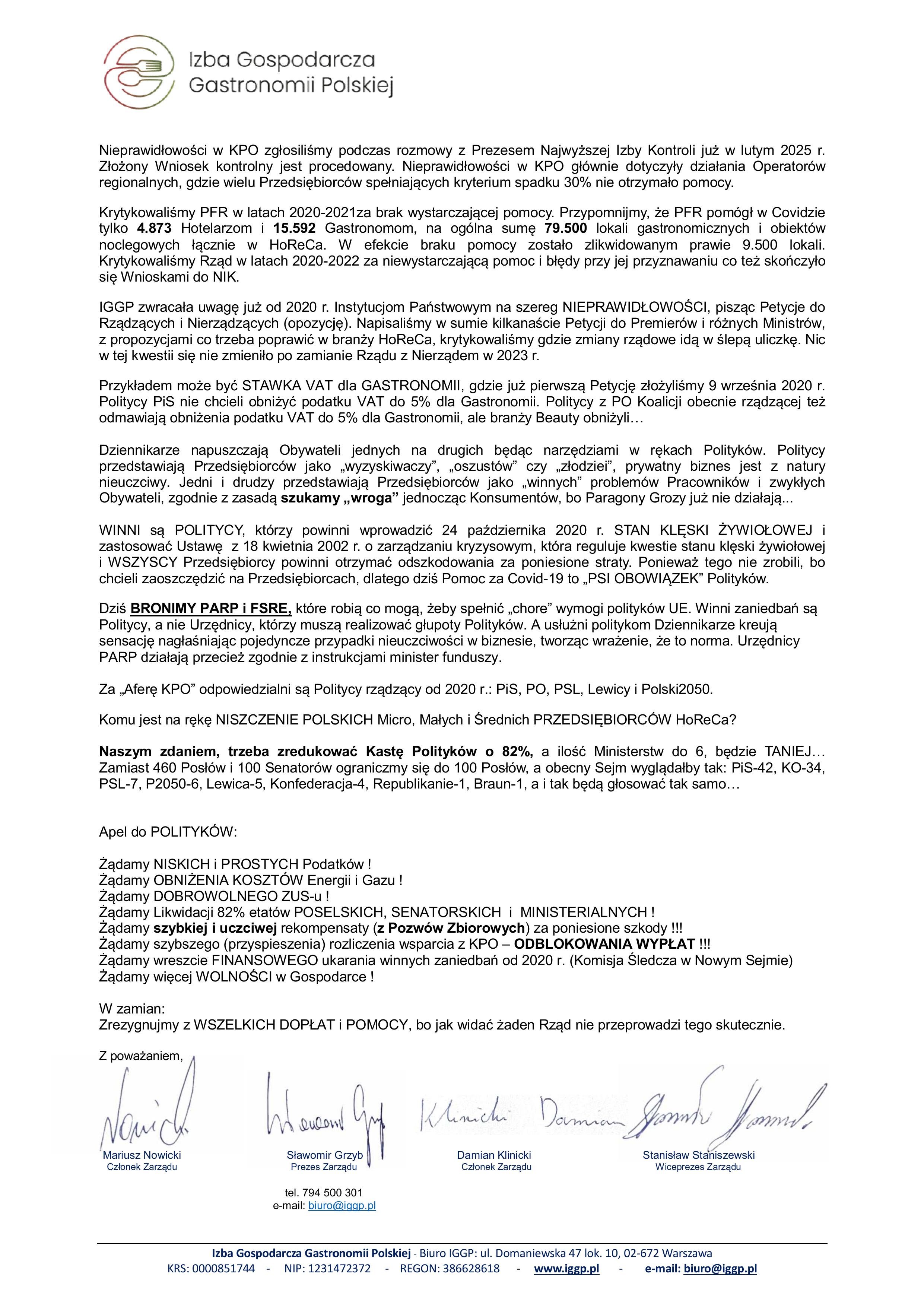 Chcemy wyraźnie zaznaczyć, że ŻADNA PARTIA POLITYCZNA nie występuje obecnie w interesie branży HoReCa, i tak naprawdę ŻADNA NIE WYSTĘPOWAŁA nigdy po 13 marca 2020 r., a jedynie poszczególni Posłowie próbowali nam pomóc, ale robili to (co można dziś ocenić) dla swoich partykularnych politycznych interesów, a nie dla prawdziwej Pomocy Przedsiębiorcom (mikro, małym i średnim).